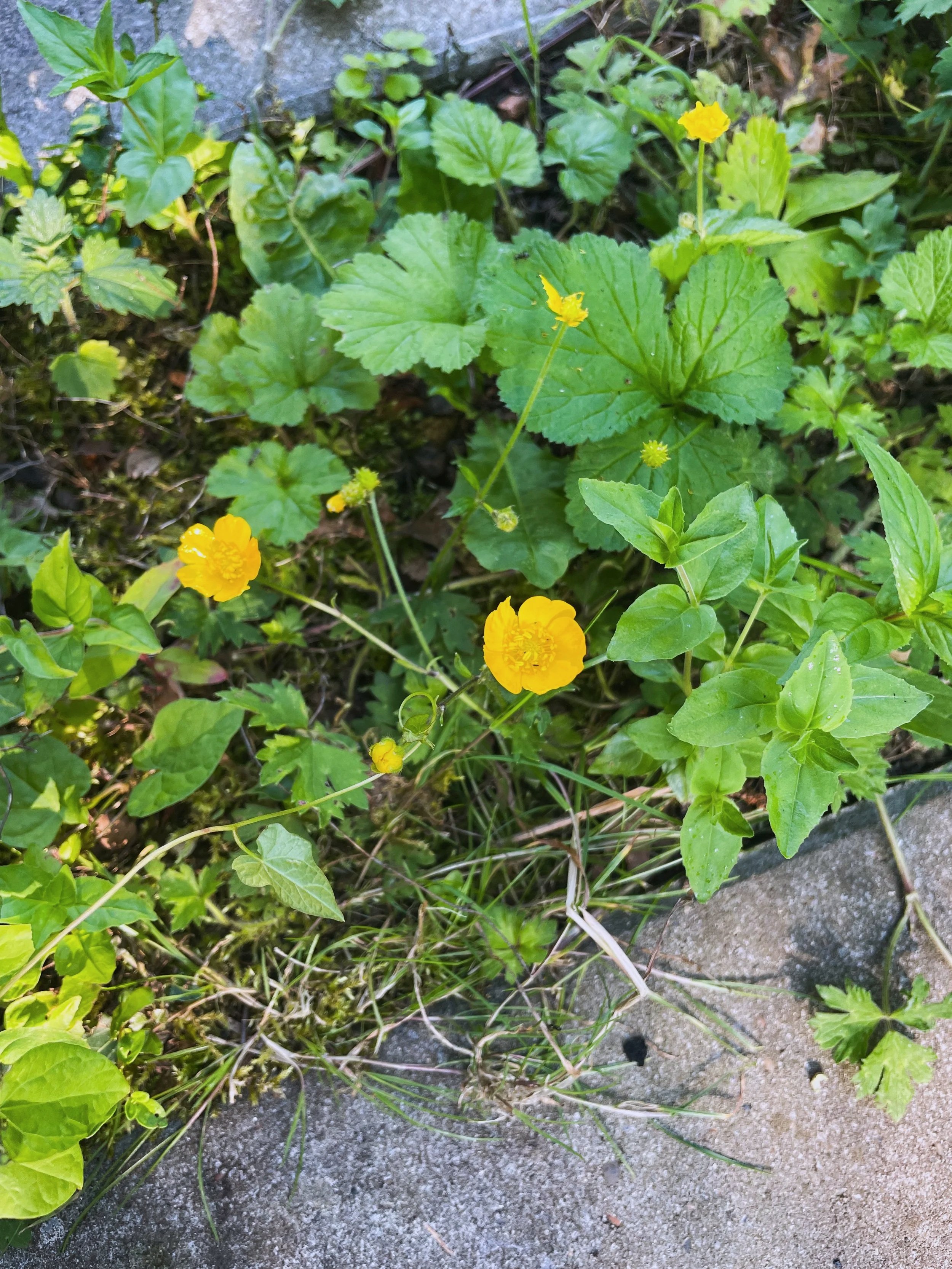 Bidende Ranunkel vokser, sammen med andre små hjemmehørende urter, mellem trædesten.